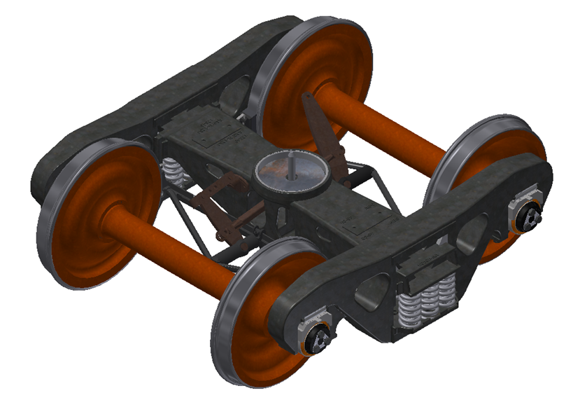 A typical two-axle truck assembly consists of a truck bolster, two sideframes, two wheelsets, four roller bearing adapters, four pedestal wear liners, springs, and any applicable brake rigging.